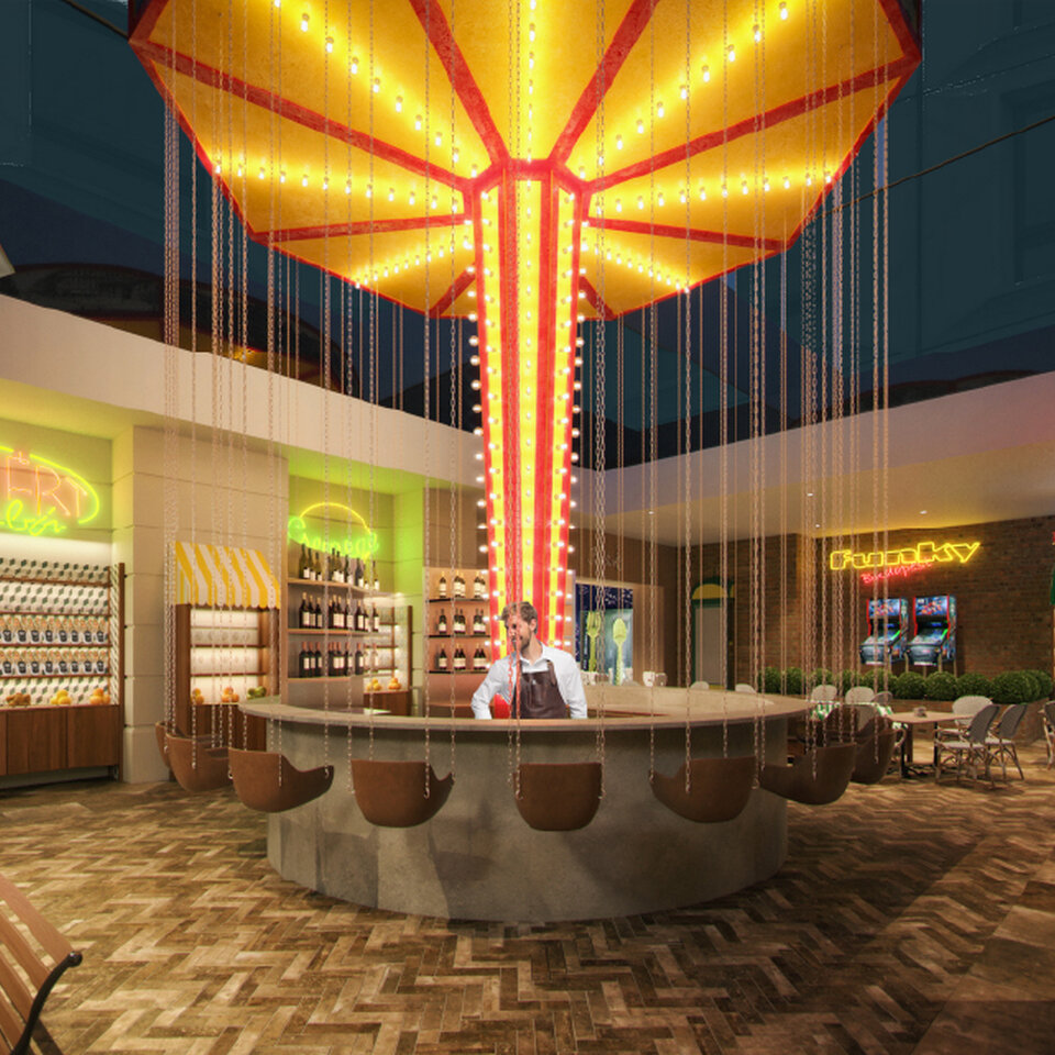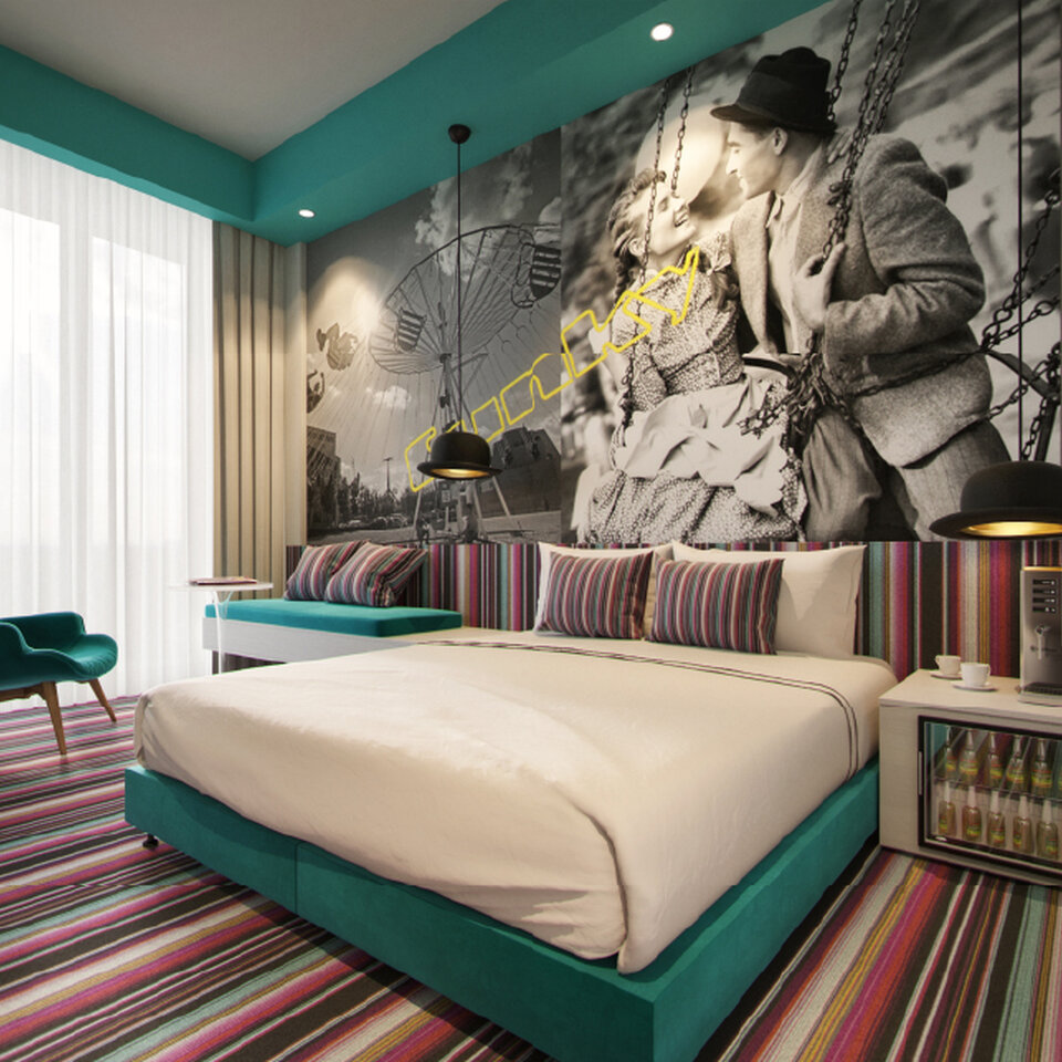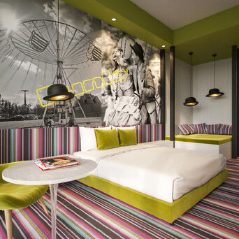 An integral part of the concept is the bar area with direct street access, designed as a partially open, covered terrace. The space comes alive with music, evening mini DJ sets, original cocktails inspired by traditional fairground attractions, and a bold visual identity, naturally becoming a social hub for both hotel guests and the surrounding neighborhood.