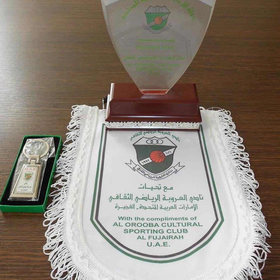 Hradec Králové / ČR, 17. září 2013 - Fotbalisté ze Spojených Arabských Emirátů se připravovali v České republice na fotbalovou sezónu i dubajský Královský fotbalový pohár. Mladí hráči strávili v královehradeckém hotelu Černigov tři týdny, trénovali na zdejším stadionu a sehrály čtyři přátelská utkání. Fotbalový trenér odměnil na důkaz spokojenosti hotelový personál symbolickou trofejí a vlaječkou svého týmu.